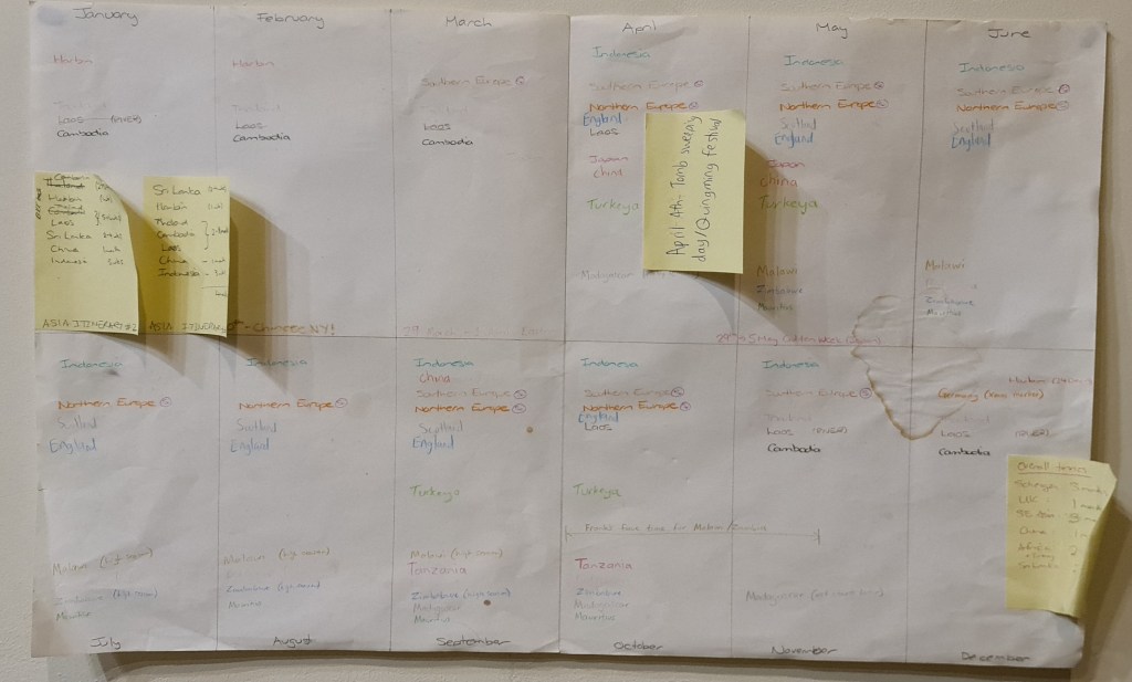 So this was our starting point but trying to get that into any sort of itinerary was tricky. Plus we didn’t want to be to cold/hot/humid. (The notable exception being Harbin.) So we made a calendar and wrote in for each month which destinations would be good to visit (extra notes for Chinese New Year, Golden Week, etc).