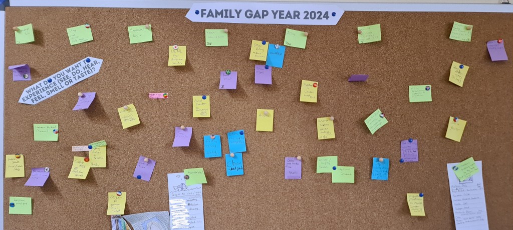 We decided to get a cork board for everyone to put up their ideas. Each family member had their own coloured post it notes to contribute. And you could vote on someone else’s ideas too. You will notice a few random (thinner style) notes in there which are from visitors: