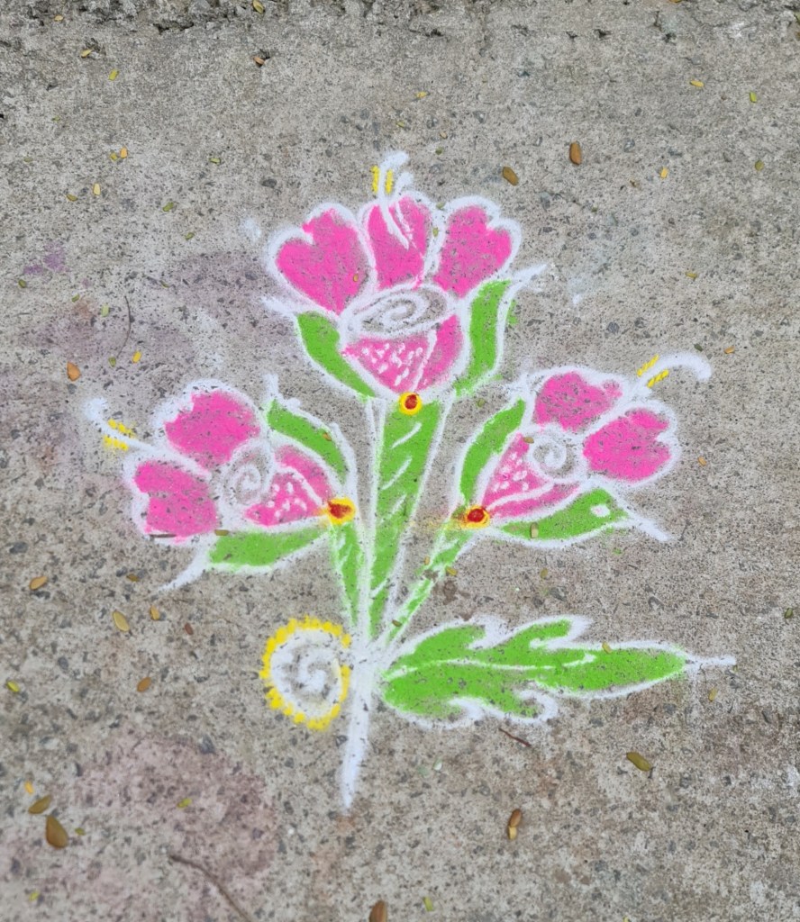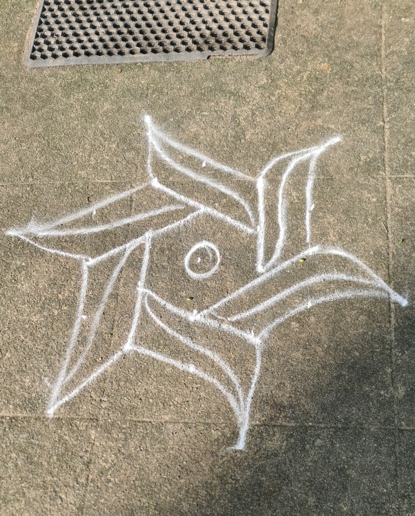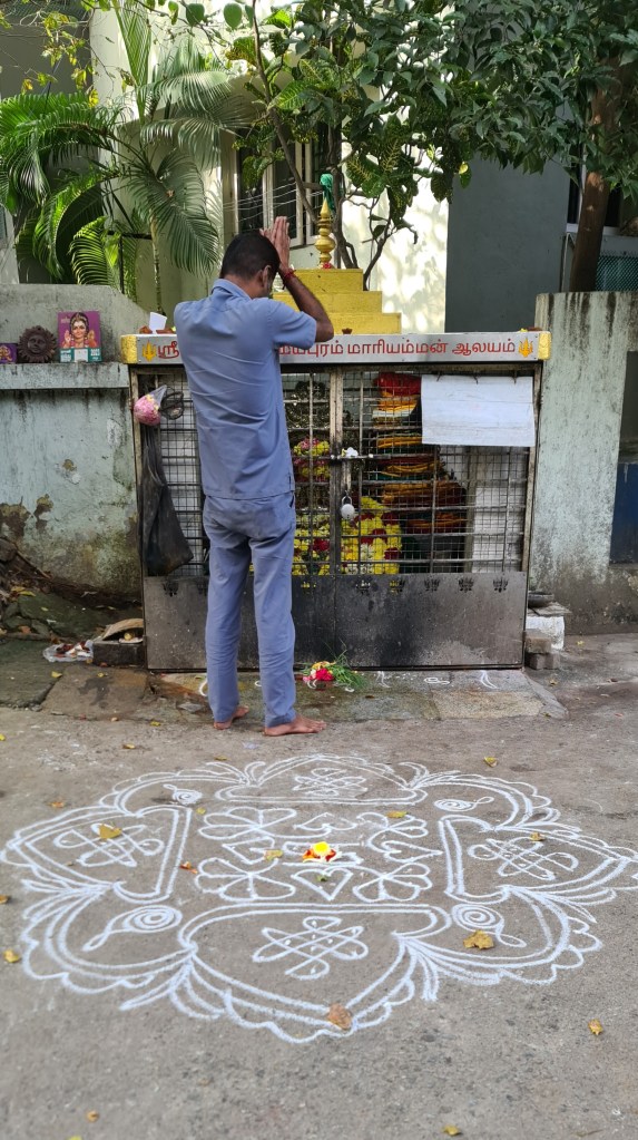 And a little shrine that I walked past daily to go to yoga which always had someone stopping had a quite large and intricate kolam with flowers placed in the centre: