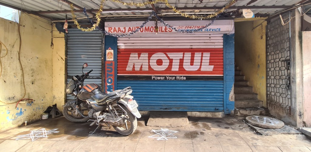 The local bike repair shop with three kolams. I am guessing for each house and the business: