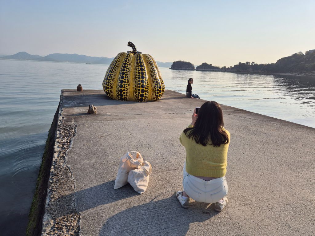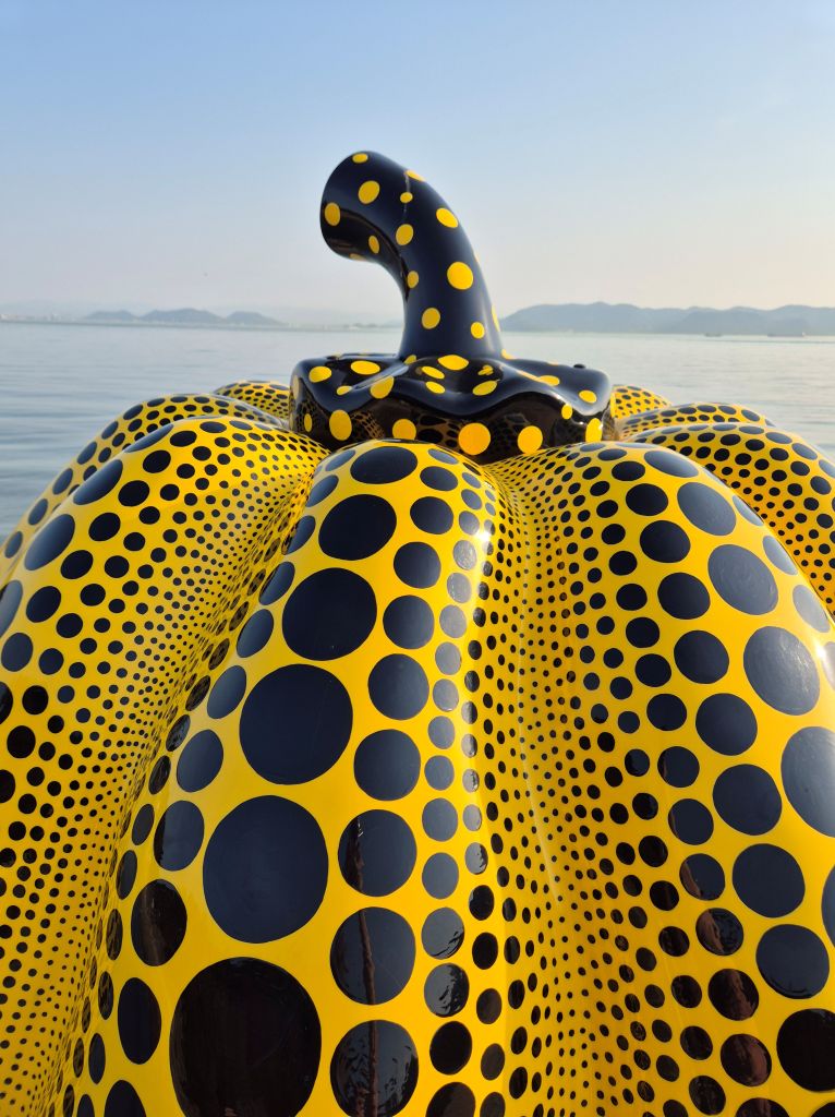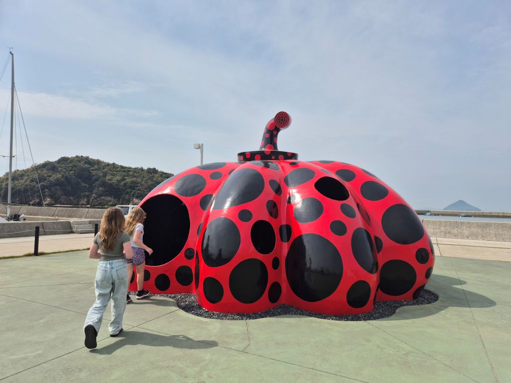 We diverted off the extremely well beaten path to the fairly well beaten path to the island of Naoshima, famous for its yellow and black spotted pumpkin for a couple of days. We stayed on the quieter side with a severe lack of restaurants, made up for by art. We stuck to the outdoor / free / cheaper stuff, like the iconic yellow pumpkin which us adults managed to catch for the golden late afternoon light. We only had a short, generally quite polite line of a few people to wait for a pic.