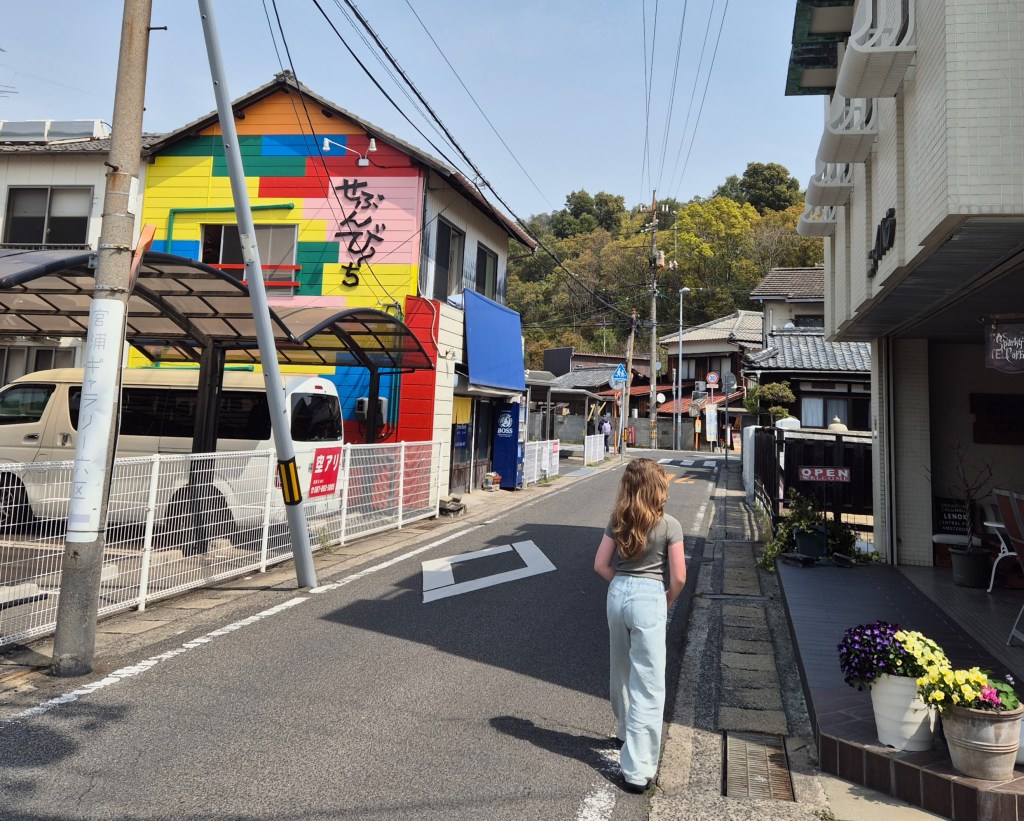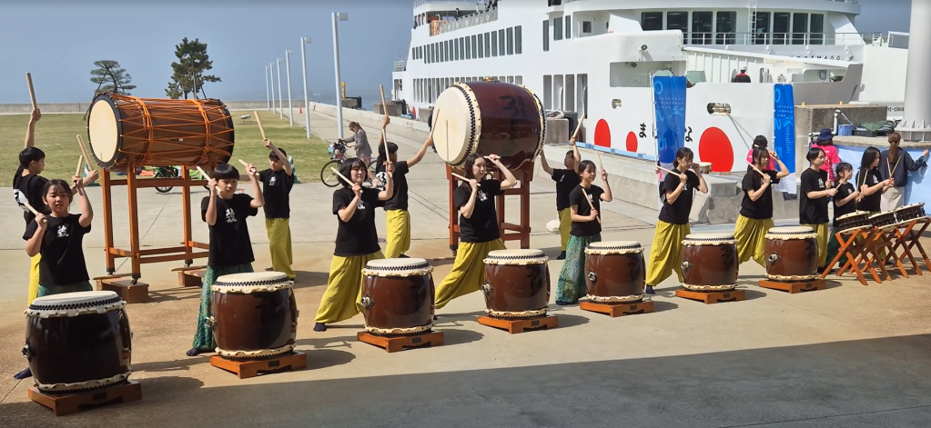 As we left, all ferries were delayed due to fog. I figured this sort of thing had to happen at some time during our trip but I did not expect it to be in Japan – but I guess even Japanese efficiency can’t control the weather! As luck would have it, we were leaving as a major art festival (Setouchi Triennale 2025) was just beginning and we got to experience the welcome: firstly some taiko drumming at the port.