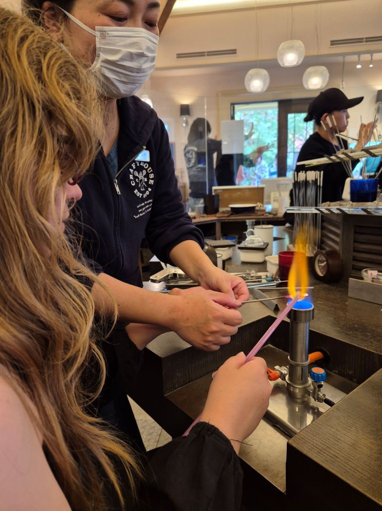 One of the services it offers is making your own bead, and, for a larger cost, adding it to your very own custom jewelry. I and Z both chose to make a bracelet, but the designs they chose to adorn them with differed. While Z chose a swirl pattern to make, I decided on a bead with gold flakes as decoration.