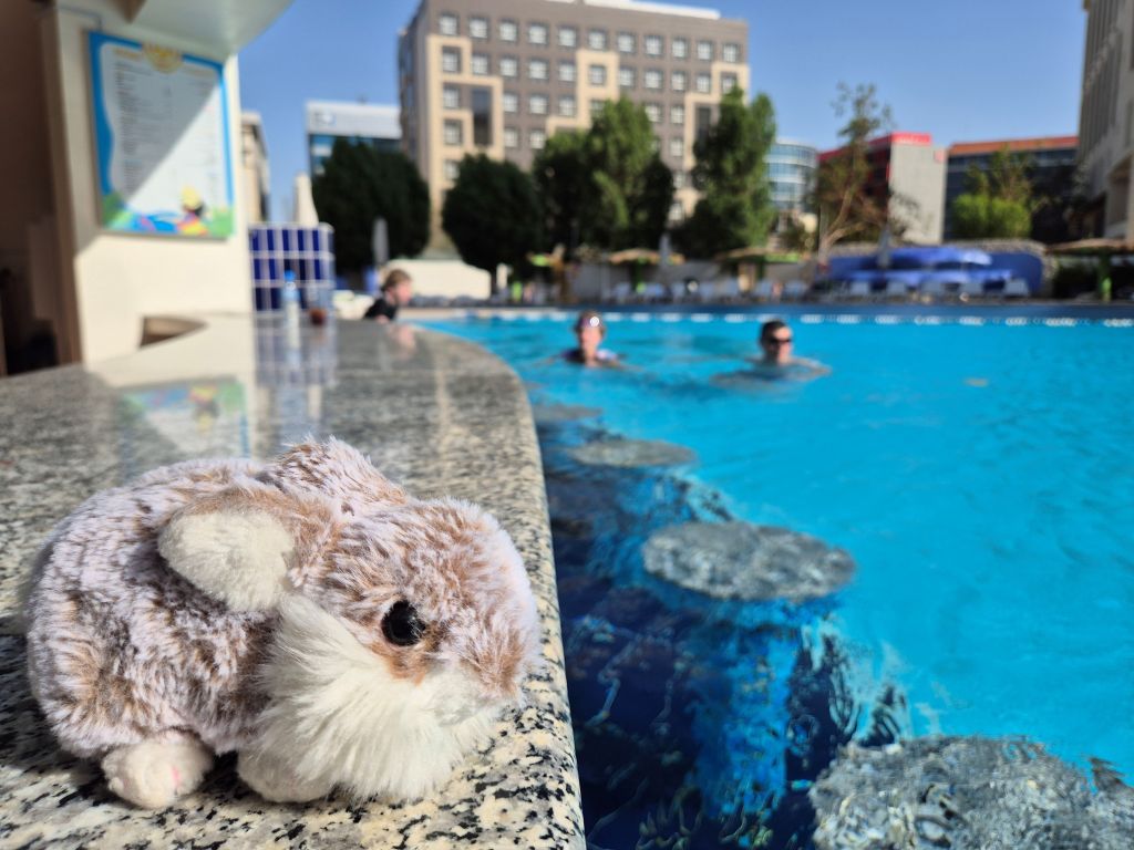 I was sooooo excited about staying at a fancy hotel with a huge pool on our way to Paris. We stopped in Doha, Qatar for a night. It was very hot and windy, so, even though I can’t actually swim, I did get blown into the pool by accident ๐ฑ Luckily, I was rescued and then dried out on the swim up bar ๐