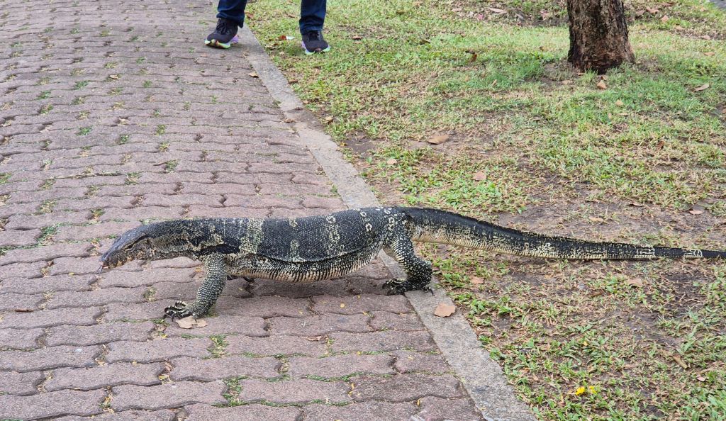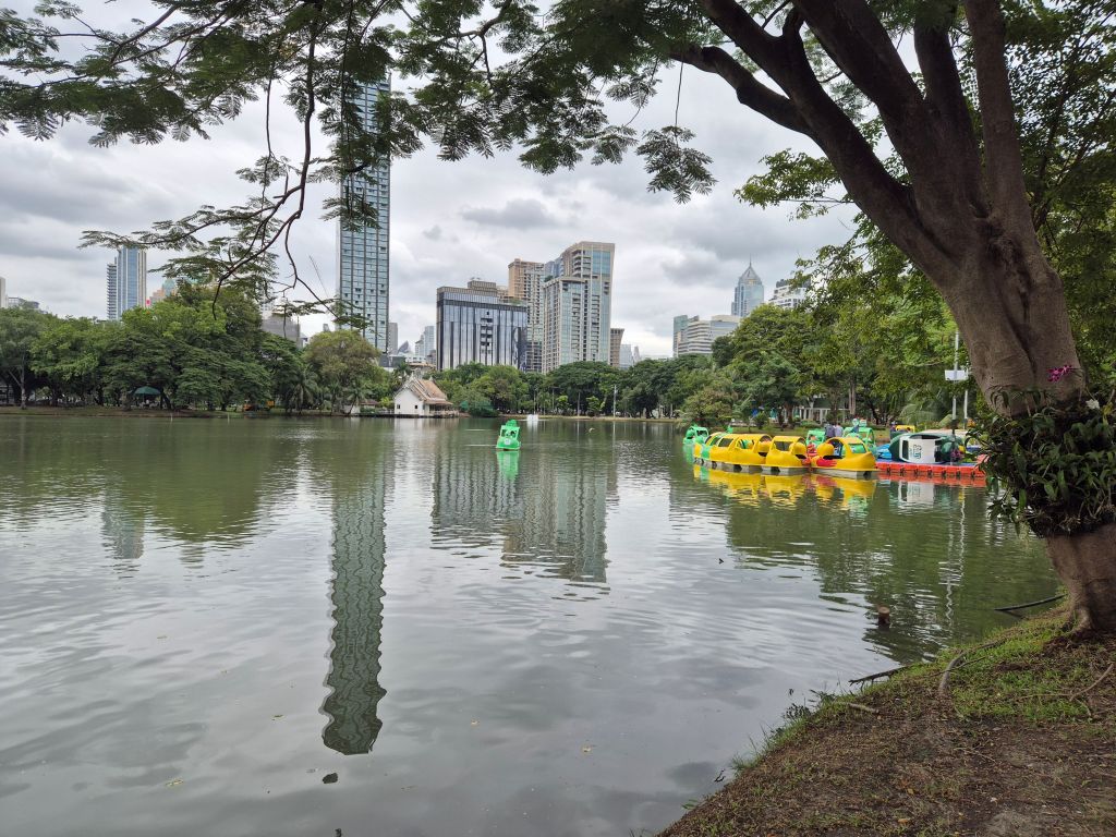 In their research, the kids had found Lumphini Park which has walking paths, giant monitor lizards roaming about, plus you can rent paddle boats. We figured this would be a nice way to spend an hour or two. We found the lizards quite easily – just look for someone taking a photo and it’s probably of one of these lizards. The paddle boats were a bit further inside the park and we could see a couple in the water but they appeared to be slightly lopsided. Hmm. How strange.
