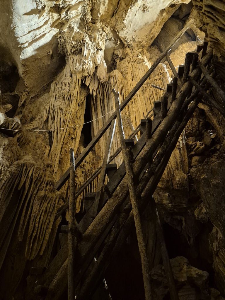 Back down on ground level, we grabbed a drink and some lunch before exploring a nearby cave. This walk had a bit of everything – a leap of faith across a rickety wooden bridge, magically large plant leaves by the side of the path, then an incredible cave filled with stalagmites and stalactites all to ourselves!