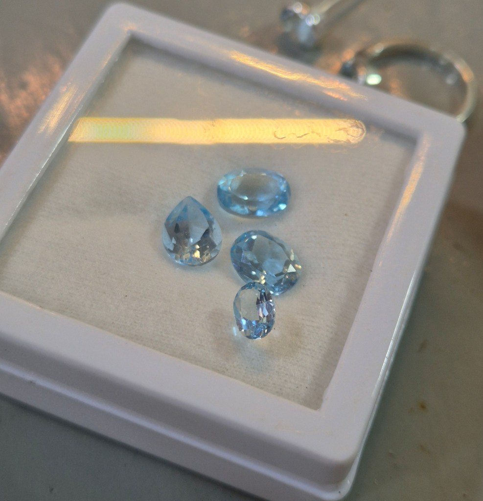 The first step was to discuss final designs and, for me, choosing gemstones! Obviously this was an extra cost but I saved money here by not choosing something like sapphires and going semi-precious blue topaz (which is actually my favourite anyway!).