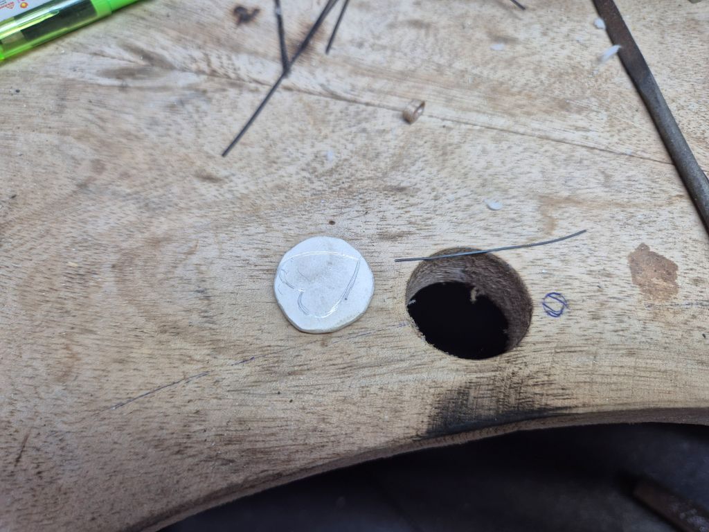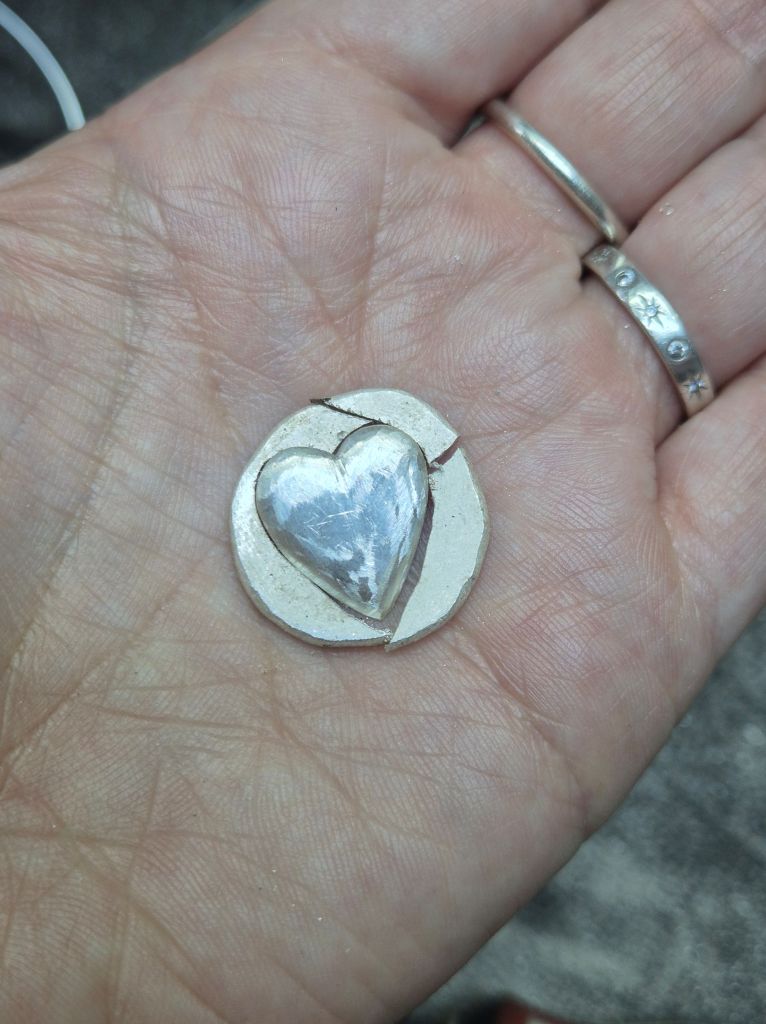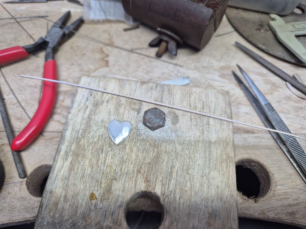 For the pendant, some more silver was melted and made into a flat circle. Then the heart shape drawn on by I to be cut out and polished.